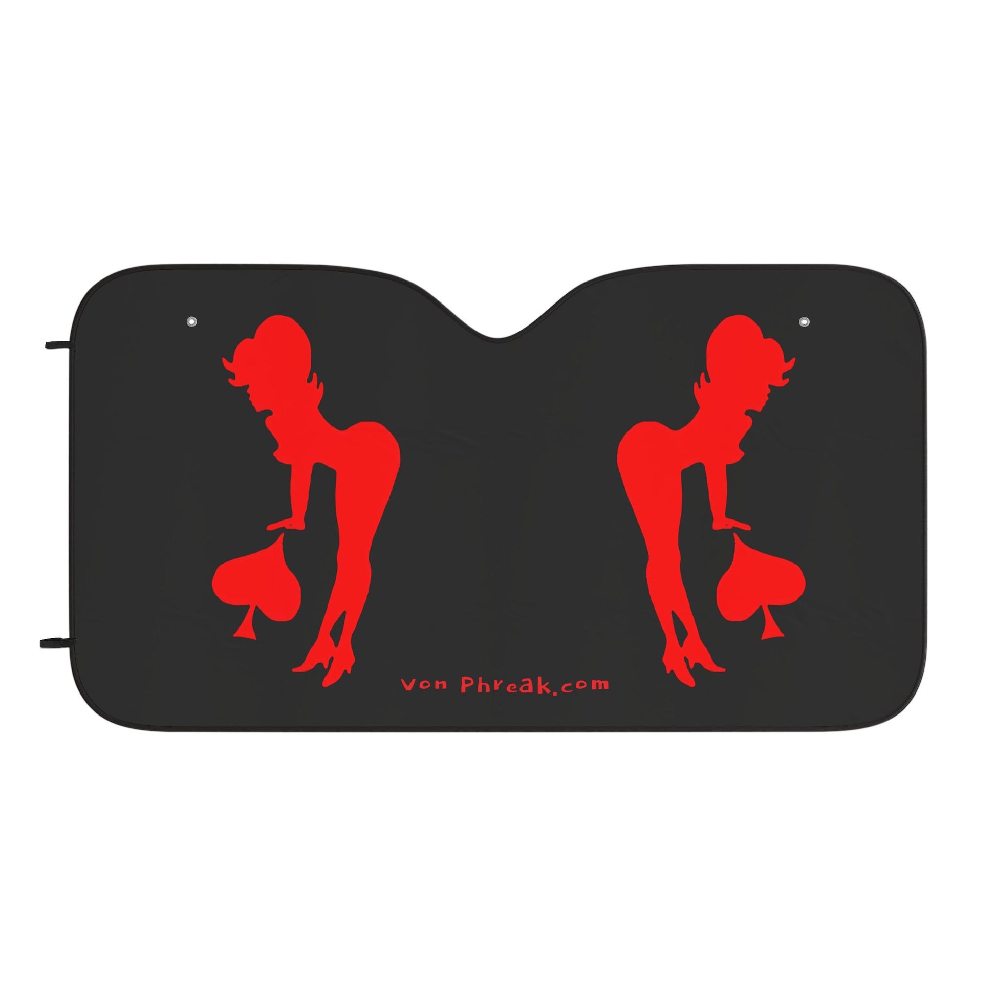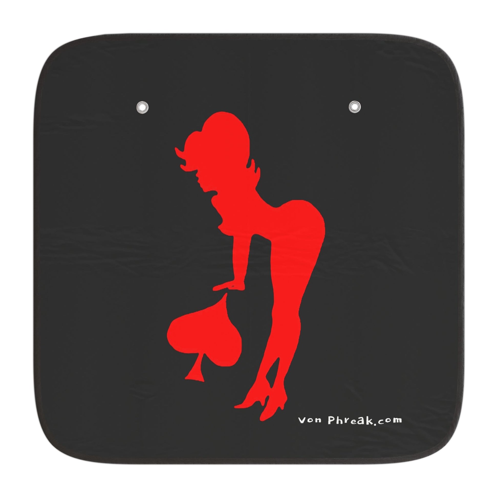Red Spade girl Mud Flap Sun Shades with Retro Design, by Von Phreak. These sun shades give off a vintage and funky vibe, perfect for car enthusiasts and retro lovers. They are relevant for road trips, beach days, and summer drives.