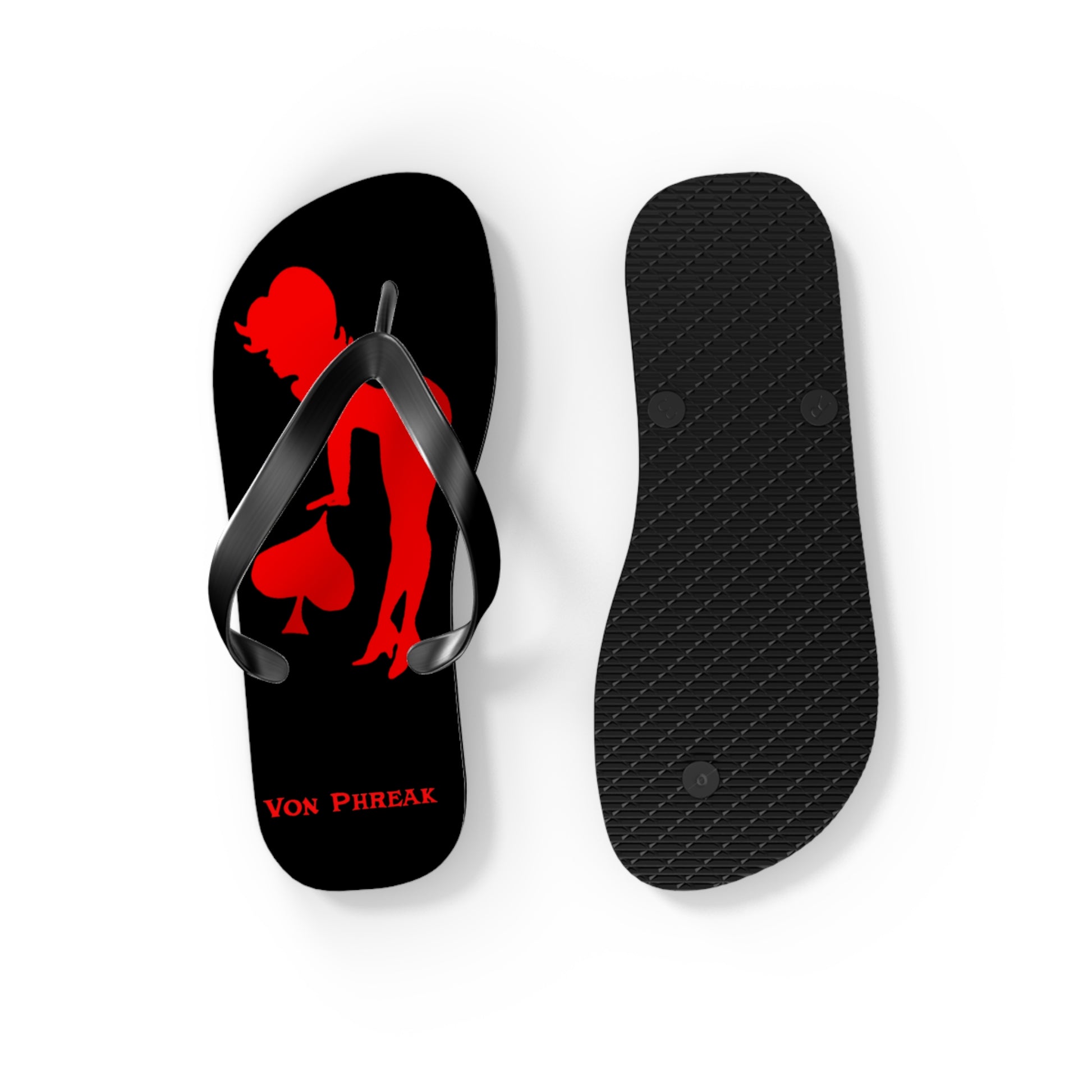 Von Phreak Rebel Flip Flops - Black with Red Silhouette of Mud-Flap Stylish Summer Footwear, Beach Essentials, Poolside Comfort, Vacation Ready, Trendy Accessories